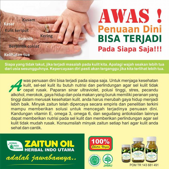 ✏ Minyak zaitun telah dipercaya secara empiris dan penelitian terkini mampu memberikan solusi untuk mencegah terjadinya penuaan dini. Kandungan vitamin E, omega 3, omega 6, dan segudang antioksidan lainnya dapat memberikan nutrisi pada sel kulit dan memberikan perlindungan agar sel kulit tidak mudah rusak. Konsumsilah minyak zaitun setiap hari agar kulit anda sehat dan cantik.